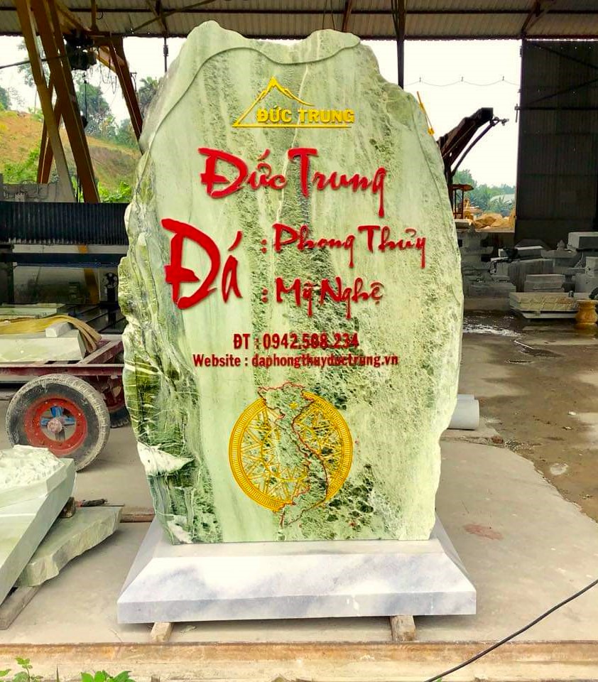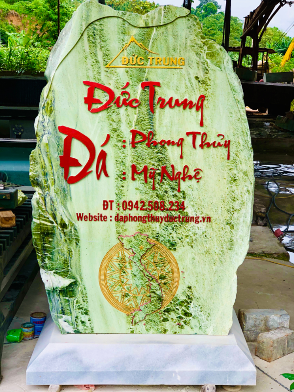 Tấm biển đá thương hiệu Đức Trung được chế tác từ đá ngọc Serpentin nguyên khối – loại đá quý tự nhiên nổi bật với sắc xanh ngọc thanh mát, mang năng lượng phong thủy an lành và trường tồn. Thiết kế nổi bật với dòng chữ khắc chìm sơn đỏ nghệ thuật, thể hiện tên thương hiệu, lĩnh vực hoạt động và thông tin liên hệ một cách rõ ràng, trang trọng.