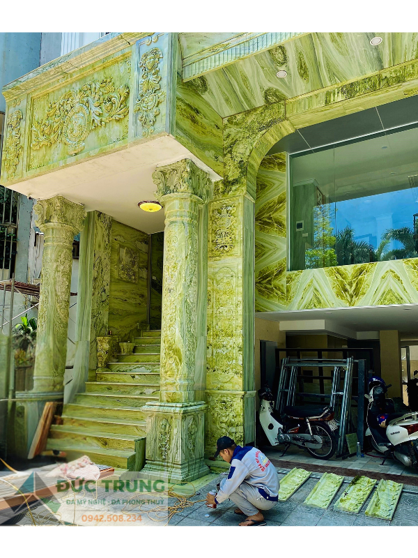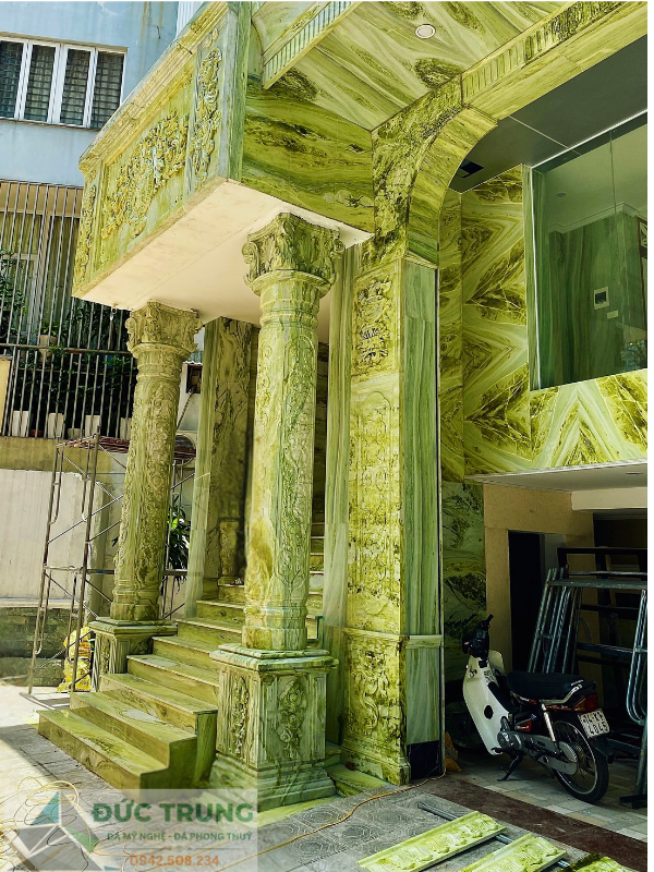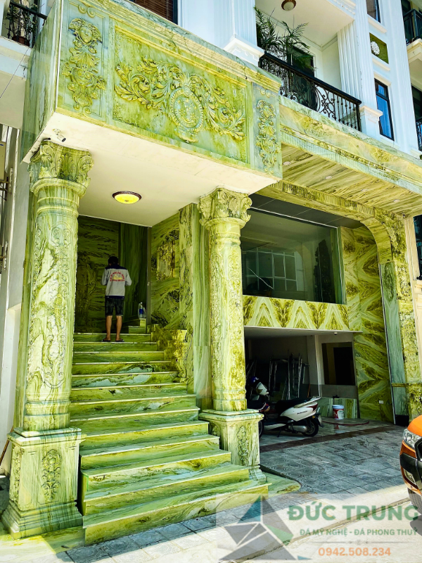 Công trình nhà ở được chế tác hoàn toàn từ đá ngọc Serpentin – từng chi tiết như cột trụ, cầu thang, phù điêu… đều tinh xảo, sang trọng và trường tồn. Sự lựa chọn xứng tầm cho gia chủ yêu vẻ đẹp vĩnh cửu.