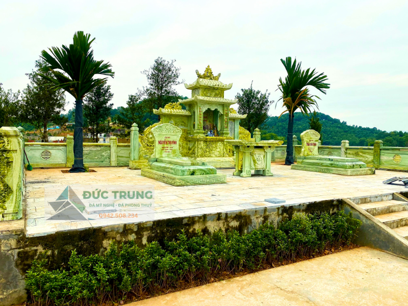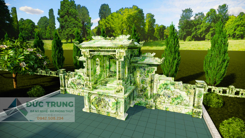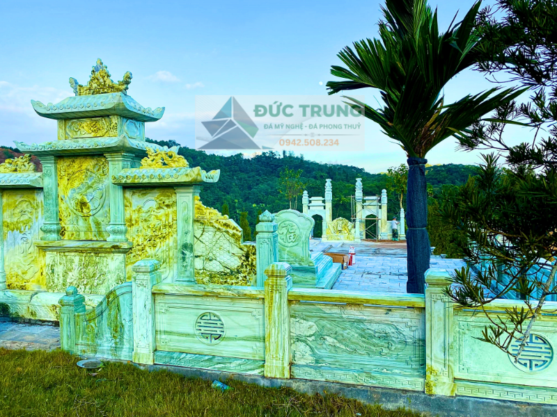 Các cấu kiện đá phụ trợ như bậc tam cấp, lan can, bàn hương án... đều được thiết kế thống nhất về chất liệu và hoa văn, tạo nên tổng thể hài hòa – linh thiêng – tôn nghiêm.