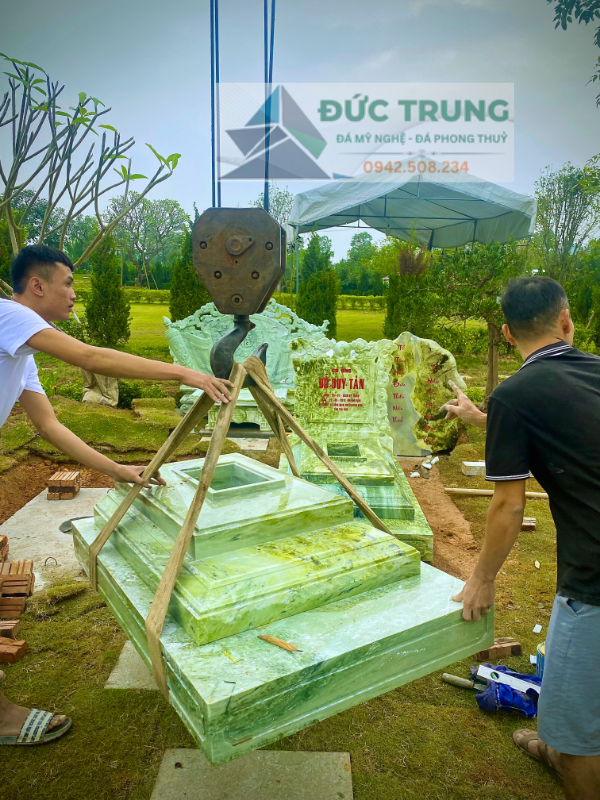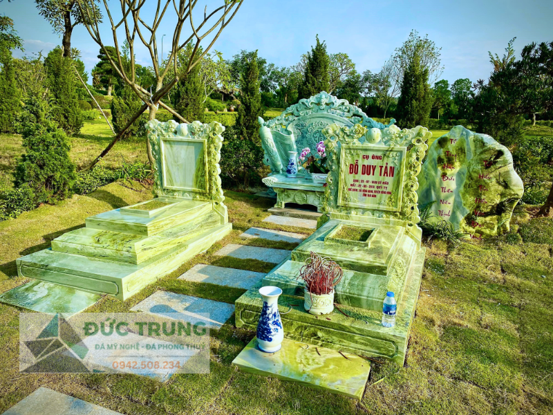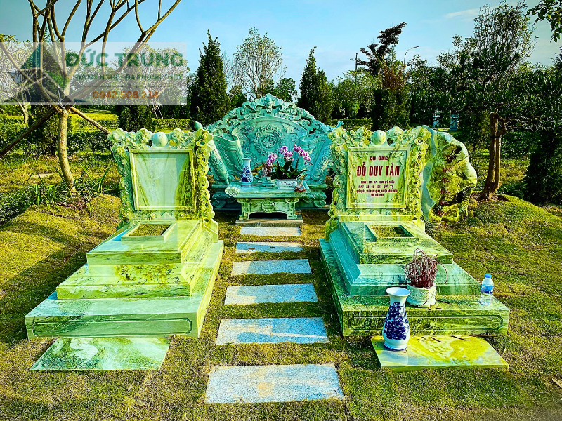 Mộ đá đôi là công trình tâm linh đặc biệt, thể hiện tình cảm sâu nặng và sự gắn bó thủy chung giữa hai người quá cố. Sản phẩm được đặt tại Công viên tưởng niệm Thiên Đức (Phú Thọ), nổi bật với chất liệu đá ngọc serpentine tự nhiên – loại đá quý mang màu xanh ngọc đặc trưng, tượng trưng cho sự thanh khiết, trường tồn và bền vững theo thời gian.