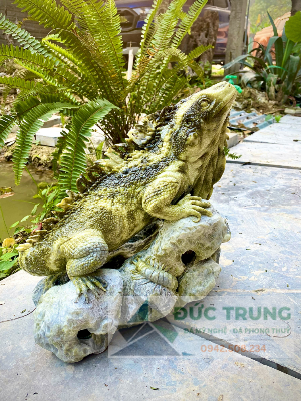 Linh vật được tái hiện sống động với từng lớp vảy, dáng uốn lượn uyển chuyển và thần thái đầy oai vệ. Tư thế vươn cao, đặt trên thế đá tự nhiên tạo cảm giác như linh vật đang canh giữ long mạch – mang đến sự bảo hộ, tài lộc và vượng khí cho gia chủ.